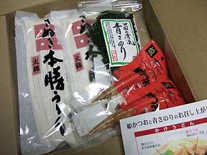 高槻の父上より「亀城庵さぬきうどん」が届く。今回はうどんは少なめで、その代わりに「姫かつお」と「青さのり」も含まれているぞ。