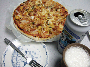 涙の土曜出勤日・・・。昼はいつものスパゲティ・バジリコ(大手町「リトル小岩井」)。「ひとえき族」して帰宅。8チャンネル18:30からの「もしもツアーズ」金時山を見たが、キャイーンやカバちゃんたちのお笑いバラエティでは山歩きの雰囲気が伝わってこない。限界がありますな。そもそも冒頭の10分間、登山前の蕎麦屋の紹介は長過ぎ。期待はずれの巻。三枝子さん特製ピザ&チャーハン、ロング缶2つ、焼酎水割り。ところでキリンビールの「勝ち樽」当選です!1520ml樽と専用サーバーが送られてきました。やったね!