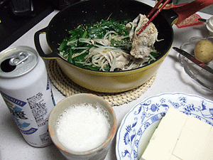 朝、八が崎室内コートでテニス、蒸し暑く大汗。いったん帰宅、シャワー後に迎えが来て、常磐道土浦北インターからつくば市の大池公園テニスコートまでドライブ&テニス。和風れすとらん「キャニオン」でハンバーグ&海老フライのAランチ(893円)。雨が降り続くなか、きょうは幸運にも「くもり」の天気予報だったが、途中で晴れ間も・・。おかげで日焼けしたぞなもし。コート脇の市民研修センターのお風呂(210円)に入ってすっきりした面々であったが、おいらは“お風呂セット”を持参しなかったせいで、そのまま帰宅18時30分。やっとこさ汗を流して夕食は(わが家ではお馴染みとなった)「タッキー鍋」(=写真)、冷ややっこ、じゃがバター、ロング缶2つ&焼酎水割り。