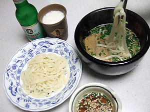 今週2回目の“休肝”日。夕食は、「亀城庵さぬきうどん」生うどん250gを茹でて、冷やしうどん=写真。サントリー「ファインブリュ−」ビールテイスト飲料、アルコール分0.5%未満のロング缶500ml。