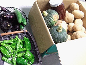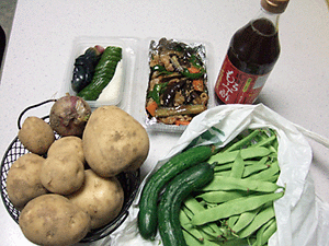 南アルプス市の中田パパより手作り野菜(さやいんげん、きゅうり、じゃがいも)直送のおすそ分けあり!とのK大姉のメール。会社帰りに、K大姉の手づくり「惣菜」「お新香」&沖縄・石垣島の「もろみ酢」とともにゲット=写真。この日の夕食は、この惣菜とお新香にてロング缶2つ。焼酎お湯割り・・。