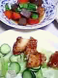 昨日の「さやいんげん」はさっそく野菜煮に彩りを添える。「きゅうり」はチキン唐揚げサラダに使用。
