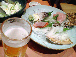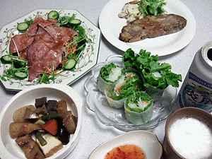 しかし思いがけない今日の昼間の雨のように事態は急展開。三枝子さんが北千住「丸井」地下の食料品売り場で買ってきた惣菜(生春巻き、ローストビーフサラダ、ミートローフ、煮物)で、自宅にてプチ宴会(=写真)となってしまった。〆は、鯛刺身を握り寿司で・・。ロング缶2つ&焼酎水割り2杯。なお昼食は(いつもの社員食堂で)メカジキのジンジャーフライ定食、おかず(さつまあげ煮)一皿追加して総計645kcalであった。