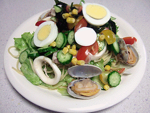 朝、7時40分東洋学園大コートに到着。“あがし”と“カオリン”に「はやっ!」と言われる。テニス10時まで、大汗。「ココス」にて、ゴマダレ冷やし中華麺&ドリンクバー。ひと雨来そうな空模様・・。「麒麟淡麗アルファ」350ml缶飲んで、ちょっと昼寝。昨日に続いて「健美の湯」へ。帰って夕食は、三枝子さん特製シーフード・サラダスパゲティ=写真。「麒麟淡麗アルファ」ロング缶2つ、焼酎水割り。