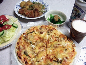 涙の土曜出勤日・・・。昼はおなじみのスパゲティ・バジリコ(リトル小岩井)。夕食は三枝子さん特製ピザ=写真。冷蔵庫に置いているピザ生地も撮影、あと2回分の量があります。