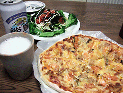 朝、八が崎室内コートでテニスのあと、栗が沢コート会議室での早朝テニスクラブ役員会へ。11時帰宅、素麺(2輪)をちゅるちゅる(朝昼食)。昼寝のあと「健美の湯」へ。夏休みのせいか、ガキが多いぞ。先日のピザパイ生地がまだ残っていたので、ピザ&サラダ(=写真)でロング缶2つ&焼酎水割り。TVで「キネマの天地」を観つつ350ml缶。まあ、多士済々の出演者だったね。藤山寛美も出ていたんですな・・。
