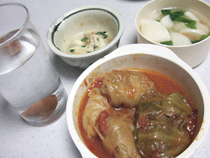 涙の土曜出勤日・・・。老舗「赤福」の欺瞞にショックを受けている人がけっこう周囲にいますなぁ。世の中、信じられないことばかり・・。さて、昼はお馴染みの大手町ビル地下「リトル小岩井」でスパゲティ・バジリコ(560円)&キャベツ酢漬け別盛り(50円)。夕食は、三枝子さん特製ロールキャベツ、アジ味醂干し、ロング缶2つ&焼酎お湯割り。