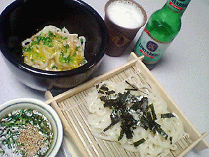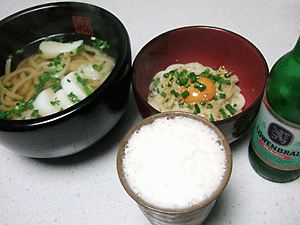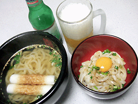 さて今週1回目の“休肝”日、亀城庵「さぬき本膳うどん・太麺300g」の半分を茹でて「釜玉うどん」&「ざるうどん」=写真。独レーベンブロイ・アルコールフリー(アルコール分0.5%未満)330ml。