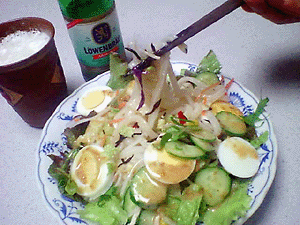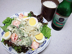 今週1回目の“休肝”日、夕食は亀城庵「さぬき本膳うどん・太麺300g」の半分を茹でて「サラダうどん」。独レーベンブロイ・アルコールフリー(アルコール分0.5%未満)330ml。