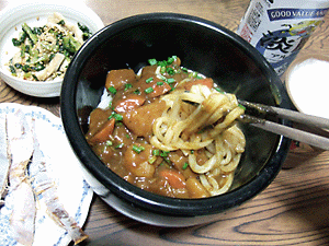 この寒さは一体なんだ?朝と夕方、オーバーコートにマフラー手袋が必要かも。今朝はふるえながら出勤・・。夕食は、亀城庵「さぬき本膳うどん・太麺300g」の半分を茹でて(水洗いせず)釜あげで「カレーうどん」としていただく。昨日の特製カレーを利用。うどんは“しっとりねっとり”でまいう〜!!今週1回目の“休肝”日の予定をケロっと変更、スルメ焼とともにロング缶2つ&焼酎お湯割り。
