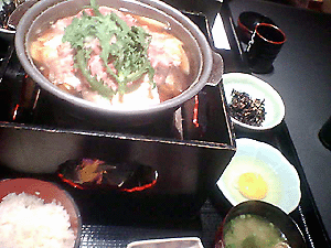 チョーさん来訪で、たまにはランチグルメするかとKDDIビル2F「つきじ植むら大手町店」。12時から店前で10分ぐらい待つ。「お次の方どうぞ」と店内席に座ってお目当ての「すき焼き定食」(1200円)。われわれのグルメなんてこんなもんだ。