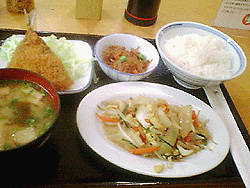 レッスン終わって今週2回目の“休肝”日実行ということで「まいどおおきに 日本一の食堂」小川町食堂でトッピングしたのはアジフライ、野菜炒め、切り干し大根、めし、味噌汁、〆て589円也。昼に比べてかなりさびしい食事メニューであった。