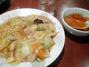 昼は大手町農協ビル地下「永楽」で中華丼(850円)=写真左。昼も夜も“麺類”じゃ芸が無いわさ、考えた末の選択であった・・。とろみサイコー!!