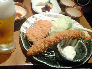 週末のハナキン、カミさんと食事。北千住マルイ9階「名代とんかつ かつくら」で、名物の「かつくら膳」(2180円)を初体験。はじめに自ら胡麻をすり、特製ソースと合わせて待つ。そこに運ばれてきたのはでっかい海老フライとヒレカツ、フォッフォッフォ(狂笑)、生ビール2杯=写真。キャベツ、味噌汁、麦ごはんはお代わり自由。キャベツの刻み加減、細くて柔らかくてサイコー!昨晩の貧しい食事とは雲泥の差・・。久しぶりの“超”満腹で大満足。しかも“太っ腹”三枝子さんの“ごち”、というよりここは家計からの支出じゃろ。