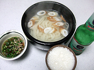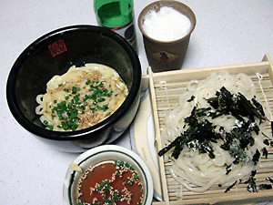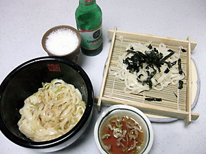 さて今週1回目の“休肝”日、亀城庵さぬき本膳うどん(太麺=1袋300g)を茹でて「かけうどん」&「冷やしざるうどん」とする=写真。独レーベンブロイ・アルコールフリー(アルコール分0.5%未満)330ml。