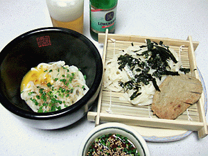 帰宅して今週2回目の“休肝”日、亀城庵さぬき本膳うどん(太麺=1袋300g)を茹でて「釜玉うどん」&「冷やしざるうどん」とする=写真。独レーベンブロイ・アルコールフリー(アルコール分0.5%未満)330ml。亀城庵さぬき本膳うどんの“賞味期限”が1月26日だったが、気にしない。全然気にしない!あと1袋残っているぞ。さて今年も残すところ、あと11ヶ月じゃ・・・。