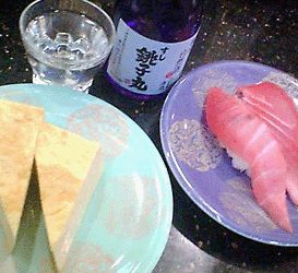 帰宅して三枝子さんから後れ馳せ(おくればせ)ながら、思わぬ誕生日祝い(2万円)をいただいたしゅうちゃん、つい“太っ腹”になり夕食は八柱の回転寿司「銚子丸」で“ごち”する羽目に・・=写真、生ビール2杯、冷酒、総計6300円也、もちろん八柱まで歩いて往復!