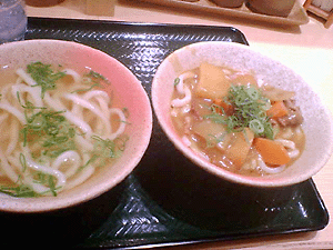 本日今週1回目の“休肝”日とする。いつオープンしたのか全然気がつかなかった神田東口の「はなまるうどん」で、かけうどん(小)&カレーうどん(小)合計504円。