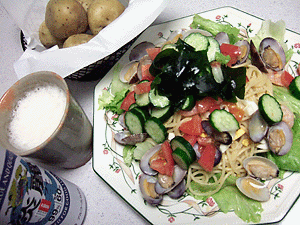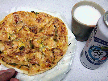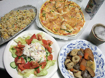 涙の土曜出勤日・・。昼は例によって大手町ビル「リトル小岩井」で“定番”スパゲティ・バジリコとキャベツ酢漬けの別盛り、計610円。夕食は、久しぶりに三枝子さん特製ピザ、ポテトサラダ、煮物(蒟蒻、さつま揚げ、竹輪、人参)、炒飯、ロング缶2つ&焼酎お湯割り=写真。だれ?カロリーオーバーとちゃう?と疑っているのは?