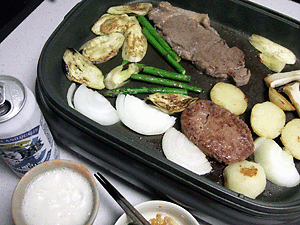 朝、八が崎室内コートでテニス、蒸し暑くて大汗。その後のコーヒータイム、“まごつく”ケータイの基本操作について話題が終始した。10時半帰宅、お風呂入って三枝子さん特製カレーライス&350ml缶2つ。コテッと昼寝。雨降り続き、ピアノ練習の好機到来。夕食は鉄板焼で。メインはオージービーフ、野菜はエノキ、エリンギ、ピーマン、タマネギ、キャベツ。〆はガーリックライス、ロング缶2つ。嗚呼、また体重増えそう・・。