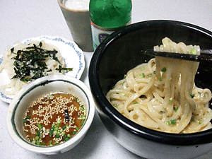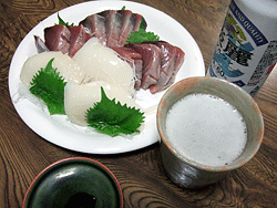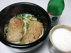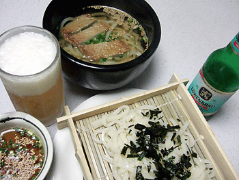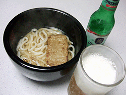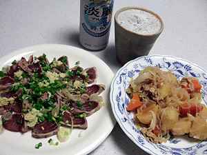今宵の“休肝”日メニューは、加ト吉冷凍さぬきうどんで“粗食”かけうどん・・。じゃこ天を加えて、独レーベンブロイ・アルコールフリー(アルコール分0.5%未満)330ml。ぺろっと平らげて今晩はこれ一杯だけにしておこう!と決めたちょうどそのときに、三枝子さんがカツオとイカの刺身を買って帰宅。「あれっ?きょうは“休肝”日だっけ?」「そうだよ!!でもせっかく刺身があるならビールかな!?」ということで、“休肝”日はあえなく延期に・・。この顛末の起こりは、まあ、なんと言ってもコミュニケーション不足ですな。ロング缶&焼酎お湯割り。