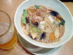 CHI BO」でいろいろ組み合わせが選べる「ハオチ−セット(1500円)」。選択したのは、季節の野菜サラダ、餃子、シュウマイ、五目ラーメン、中ジョッキ3杯(2杯はタイム半額サービス=1杯260円、3杯目を注文したのはタイムサービス時間切れ6分後であった!)、三枝子さんの“ごち”(写真=食べている途中の五目ラーメン、ちなみに1月22日以来の来店であった)。