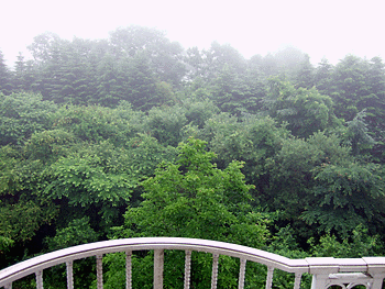 朝からザンザンと・・窓に水滴。雨の中、木々の緑はきれいに映える・・。