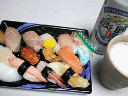 さて今宵、カミさんの帰り遅いので、松戸駅ビルの「魚河岸 大和」で特選江戸前寿司(1380円のところ賞味期限ぎりぎりで1200円に値下げ)を買って帰る(本マグロ大トロも色が変わりそう・・)。ロング缶2つ。夕食代1000円補助金もらっていたが200円超過である・・。食後にTVの前でブートキャンプ基礎編を10分だけやってみる。あー、しんど!風呂上がりに350ml缶1つ。