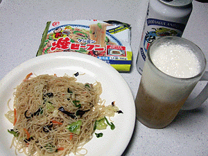 ピアノの笹やん先生とゴルフ。2日の軽井沢に続いてまた雨の洗礼か?と天気予報に一喜一憂していたが、どうやら今日の天気は大丈夫・・。朝、常盤平「らんらん倶楽部」で「Bタイム=7時10分〜8時10分」1時間1000円打ち放しの後、高速道使わずのんびりと現地に10時過ぎ到着、練習場で再びじっくりと調整。昼食して12時アウト・スタート、18ホール・スルーでまわる。今年初めて100切りゴルフ、やったね!帰宅してポテトサラダ、もずく、スルメ焼、仕上げに焼きビーフン=写真。ロング缶2つ&350ml缶2つ&焼酎お湯割り。