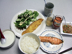 朝食の典型的一例。鮭切り身、卵焼き&キュウリ&サニーレタス=写真、納豆。飲み物はお湯で溶いた根昆布粉、野菜ジュース、伊藤園「黒酢で活性」。デザートにキウイ&ヨーグルト。昼食は社食のピーマン肉詰め定食(765kcal)。三枝子さん帰り遅いため、夕食は松戸駅ビルで買ってきた「特上握り寿司」ワンパック(1200円)、ロング缶&350ml缶、焼酎お湯割り。