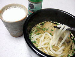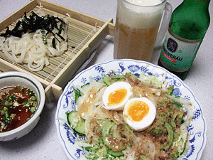 なぜか今年最高の体重記録・・。朝のジョギング!と一瞬思ったけど熱中症になってもなあ・・。“罰金ちらつく、きょうこのごろ”でありんす。今週1回目の“休肝”日実行!今宵の夕食は亀城庵「さぬき本膳うどん・太麺300g」の半分を茹でて、「かけうどん」&「ざるうどん」。ウリの漬物を添える。独レーベンブロイ・アルコールフリー(アルコール分0.5%未満)330ml。