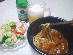 意を決して6時から朝のジョギングしていると、サアっと気持ちいい霧雨。シャワー後の計測77.6kg体脂肪率20。さて「永楽さん」から追加メール「目標達成の暁には永楽から紹興酒1本サービス致しますね!頑張れ!しゅうちゃん!」だって!?ひゃあ〜、しかしあと1ヶ月と10日しかないぞよ。本日、今週1回目の“休肝”日実行!サラダうどんにするつもりで松戸駅ビルで「エビ・イカ・ブロッコリーの塩炒め」(179g、714円)=写真中央=を奮発して買ってきたが、三枝子さんが「特製・夏野菜カレーライス」をつくったと言うので、うどんは次回に。独レーベンブロイ・アルコールフリー(アルコール分0.5%未満)330ml。それにしても朝夕の電車の空いていること!うれしくなりますな。