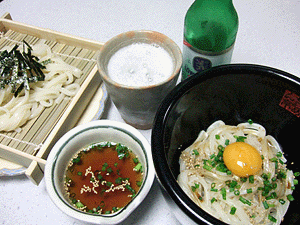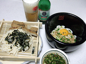 暑い・・。ビールで「暑気払い」といきたいところをグッと我慢して今週1回目の“休肝”日実行!亀城庵「さぬき本膳うどん・太麺300g」の4分の3を茹でて、「釜玉」と「ざるうどん」。独レーベンブロイ・アルコールフリー(アルコール分0.5%未満)330ml。釜玉、すなわち釜あげうどんに卵の黄身だけ乗せて、刻みねぎに白胡麻、醤油をかるくかけるだけ。ぐあっと混ぜて一気にかきこむ。これがさぬきうどんの“粋”というものじゃ。もちもちしてまいう〜!!