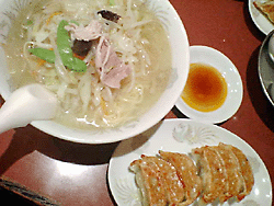 昼は農協ビル地下「永楽」でお気に入り、具沢山で熱々のタンメン(800円)=写真左。