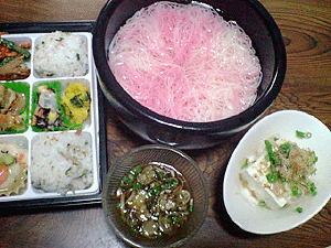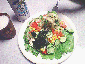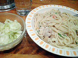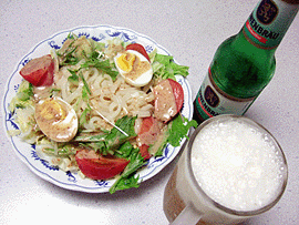 朝7時40分、八が崎室内コートに遅めの到着、テニス8時50分まで。コーヒータイムを経て、「健美の湯」でのんびり昼過ぎまで・・。ロング缶&350ml缶、ソーメン。昼寝。宇都宮のM谷くんから、「風の大地」沖田がセカンドショットを打ったが今回もストーリー大して進展せずとのメール。急いでビッグコミック・オリジナルを買いに行く。20日が日曜日だから前日に出るわけか。夕食前の計測は77.0kg。サラダ風スパゲティ=写真、ロング缶&350ml缶、焼酎水割り。ピアノ笹やん先生から29日にゴルフ予約したとメール、了解ザンスと即、返信。