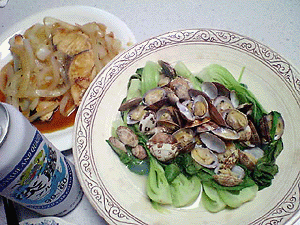 夕食はアサリ&チンゲンサイの酒蒸し、ブリと玉ねぎ煮=写真右。ロング缶2つ、焼酎お湯割り。