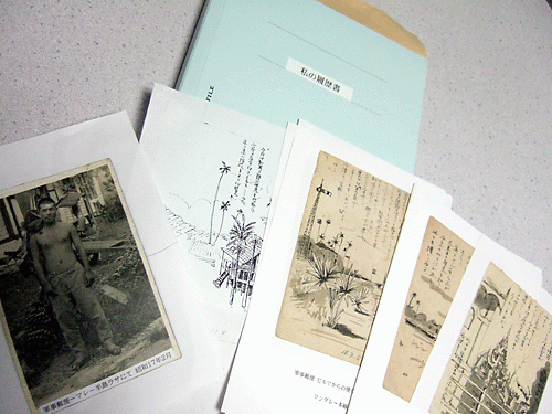 (母に届いた戦地からのスケッチ絵葉書=軍事郵便=のコピーも7点、他の参考資料とともに添付されている)