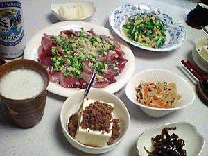 朝8時に東洋学園大コート到着、10時までテニス。右肩痛ほとんど感じることなし、半年を経ていよいよ治りつつあるか!?テニス終了後、男ふたりで「ジョナサン」へ。おいらはシーフードドリア&ドリンクバー。あとは「天然温泉 柏湯元」での〜んびり。帰宅して350ml缶2つ&梅酒の“濃いやつ”。TV観ながらバッタンキュー。夕食はカツオたたき、ニラ玉子とじ、豆腐そぼろ、お新香etc.=写真。ロング缶2つ&焼酎お湯割り。