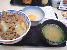 夕食は“粗食”にしようと昼食後に決心・・・。笹やんピアノレッスン終わって近くの「吉野屋」で牛丼(並)&玉子&味噌汁(総額480円)=写真。今週2回目の“休肝”日でノルマ完了。