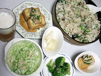 土・日と連休じゃなかったため、休養十分とは言えない週明けである。夕食前にスルメ焼いてロング缶&350ml缶、ブリ照焼き、水菜サラダ、蒲鉾で350ml缶、ご飯&アサリ味噌汁。20時、サッカー・オマーン戦を観るか、「水戸黄門」か、「家族に乾杯」か、それとも「HEY!」でタッキーか、迷って悩ましい月曜日の夜であった・・。