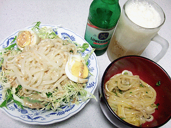 雨は夕方になってやっと止んだようだ。今週1回目の“休肝”日。さっそく亀城庵「さぬき本膳うどん太麺」(一袋300g)の3分の2を茹でて、うどんモチモチ感を味わう「水菜サラダうどん・ごまたっぷりドレッシング」&キュンと冷水で〆て、のどごし感を楽しむ「冷やしうどん」=写真。独レーベンブロイ・アルコールフリー(アルコール分0.5%未満)330ml。