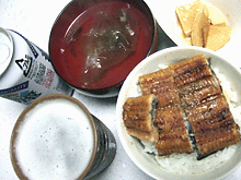 朝、八が崎室内コートでテニス。コーヒータイムを経てセール中の「スポーツオーソリティ」でいろいろ物色したがシューズの中敷だけ購入(1000円)、あれやこれやパッパと買わない自分が情けない??でも帽子やTシャツにしてもお気に入りが見つからないと、やはり買えないよね。「天然温泉 柏湯元」で汗を流して帰宅。ロング缶&350ml缶、グテ〜っと・・1年で一番長い昼間が過ぎていく。夕食はうなぎちらし寿司、厚揚げ、ブロッコリー、沢庵=写真。キャベツの千切りを先にむしゃむしゃ食べると満腹感を覚える。そうするとご飯が少なくても大丈夫とボクサーの減量体験を聞いてさっそく実践・・。ロング缶&濃い梅酒水割り。