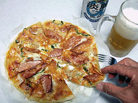 さて、ピザの支度をして出勤した三枝子さんであったが、小生が夕刻、冷蔵庫から取り出して(焦げ具合を観察しながら)オーブンで22分間焼いた仕上げはバッチリ=写真!!そのピザを独りで食べ放題。ロング缶2つ&350nl缶、焼酎お湯割り。
