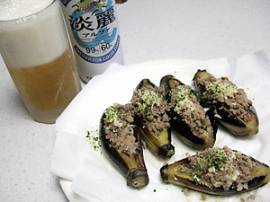 朝7時30分、常盤平の松戸テニス倶楽部で9時までテニス。16号線「マクドナルド」大津が丘店でモーニングしつつ待機。昨日に続いて11時からテニス・・のはずだったが(なにかの手違いで)コート確保できず散会。「健美の湯」を経て帰宅。バナナ、レーズンバターロールパン、350ml缶&ロング缶、梅酒「炭酸割り(ソーダ)」を数杯。バッタンキュー・・。早めの夕食は、茄子の肉みぞれ詰め=写真、味噌田楽、水菜サラダ、ロング缶。残りの炭酸水でサントリー角「ハイボール」数杯、10何年ぶりかのぅ。〆は“肉みぞれ”乗せご飯。