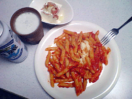 暑い。今週3回となってしまった“休肝”日をいつにしようか。思案しつつ、本日の夕食は、ペンネ・アラビアータ=写真。三枝子さんの新レパートリーとなるか?冷や奴、水菜サラダ、ロング缶&350ml缶2つ。