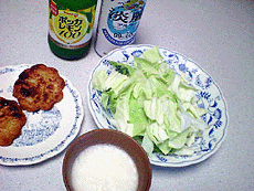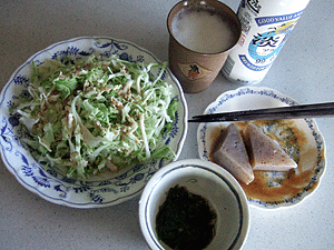 朝7時から9時まで栗が沢コートでテニス。続いて「満天の湯」に駐車、手賀沼周辺をジョギング&ウオーキング。暑くてヘロヘロ、段々スピードが遅くなり4km=28分ジャストが精一杯(その後は歩く・・)。満天の湯のサウナでメジャーリーグのオールスター戦を観ながら大汗。風呂上がり、まさかの75.1kg!?スポーツドリンク、アイスクリーム、「みかん凍結しゃりしゃりボトル」などで水分補給したら今度はお腹が冷えた・・。道の駅でキャベツ、きゅうり、ちらし寿司(昼飯)。夕食前は76.4kgだったが・・。キャベツは昨日同様にむしゃむしゃ。たまねぎ天とロング缶2つ。惣菜と冷や奴、そーめん=写真。350ml缶2つ。