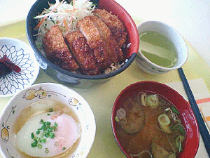 昼は社員食堂でソースカツ丼(530円)、小皿(温泉玉子、60円)追加。