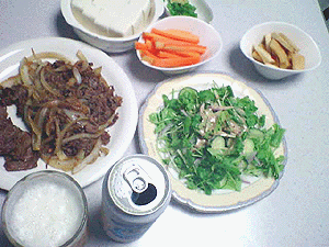 朝7時45分東洋学園大コートに到着、テニス10時まで大汗。帰宅して三枝子さんをピックアップして「満天の湯」へ。「道の駅しょうなん」の野菜市場で買物。レストランでラーメン(和風だけど微妙な味じゃ)。手賀沼自転車道を2km散歩して小汗、お風呂に入ってのんびり3連休の疲れ(?)を癒す。風呂上がり76.4kg。ソフトクリーム・黒ごま280円。家で350ml缶1つ、うたた寝。夕食前の計測76.8kg。牛肉玉葱炒め、野菜サラダ、人参スティック、大根漬、冷や奴など=写真、ポテトサラダ、道の駅で買った「おこわご飯」少々。ロング缶2つ&焼酎水割り。