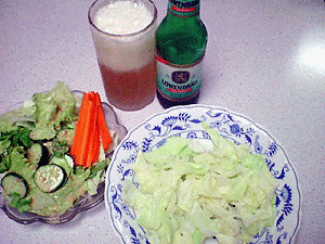 夕食は、“究極の”減量メニュー、ごま風味の野菜サラダ、『主食』には、茹でキャベツ&ポッカレモン、独レーベンブロイ・アルコールフリー(アルコール分0.5%未満)330ml。今週1回目の“休肝”日、ここまでやれば、75kgは達成するじゃろか?!