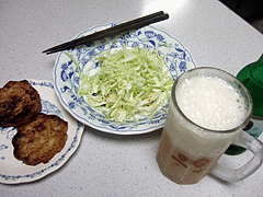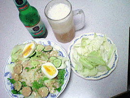 夕食は、生キャベツ&独レーベンブロイ・アルコールフリー(アルコール分0.5%未満)330ml、そしてソーメン。これで今週3回目の“休肝”日達成、それにしても「1週間で3日ビール抜き」、この暑さ続く折りにきついなア!!